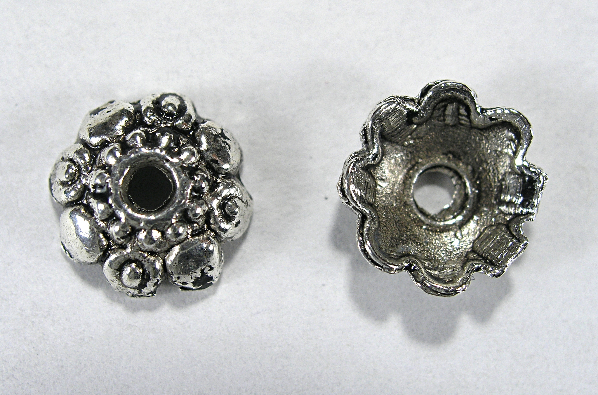Шапочка для бусин. Размер - 9х3 мм (диаметр, высота). Материал - сплав олова с содержанием цинка, с покрытием серебром 925 пробы. Поставщик - США. Цена указана за две штуки.